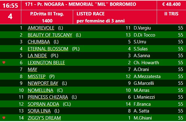 Premio Nogara 1.400 metri p.d. sono 14 le aspiranti. La corsa si qualifica come la rivincita del Premio Regina Elena. Il lotto è molto qualitativo, nessuna da escludere. Amorevole è la quarta del Regina Elena ragion per cui è la cavalla da battere. Beauty of tuscany ha vinto in bello stile la condizionata di preparazione è quindi l’antagonista. Chumbaa ha corso molta a due anni, il rientro è stato anonimo. Eternal blossom la pupilla della premiata ditta Convertino&Marcialis è poco al di sotto delle favorite, La Neide sembra chiusa da un paio di avversarie, Lexington Belle ha Newmarket è ultima ma in una corsa di GR3, May dalla Francia con ambizioni, Misstep ottava del Regina Elena con qualche rimpianto, Newport Bay a due lunghezze da Beauty of Tuscany, Nomellina il dilemma della Dormello Olgiata o tutto o nulla, Princess Chizara nel Regina Elena è 16ma, Sopran Adda ha fatto un gran rientro in Handicap, Sora lina ha vinto facile a Roma, Ziggy’s Dream è l’ospite inglese, pericolossima.