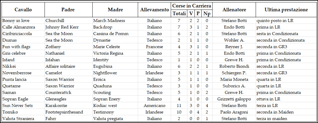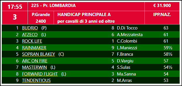 A capeggiare la compagnia Budrio (in foto) con i suoi 63 kg, in sella Dario Di Tocco. L’ultima a Roma non è stata esaltante ma la classe c’è ed il riscatto è dietro l’angolo. Tutti gli altri non staranno a guardare, avversario diretto Atzeco che è tornato ai livelli del suo nome. Rock life ritrova Claudio Colombi e questo è un fattore, Rainmaker ha tentato il salto triplo e non è andato male, Sopran Blakley è passato sotto le dipendenze di Pierangelo Pirisi ed il cambio sembra che abbia giovato, Arc on fire ai mezzi ma non la forma, Masterwin è rientrato a Firenze dopo un lunghissimo stop, a tre anni era uno dei migliori, incognita. Forward flight ha incominciato a correre in Italia dallo scorso marzo, a maggio ha vinto 2 handicap consecutivamente. Tendentious è cavallo in crescendo, il pesino potrebbe avvantaggiarlo parecchio.