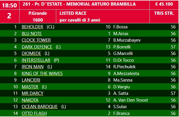 Si corrono il Premio Estate Memorial Arturo Brambilla ed il Gran Premio d’Italia. Le competizioni sono riservate ai cavalli classe 2021 ovvero i tre anni. Un lunedì straordinario in quel di Milano con inizio alle ore 18.15. A fare da contorno alle due Listed Race ci saranno cinque handicap che molto probabilmente faranno la gioia di qualche fortunato scommettitore.