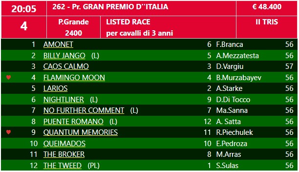 Nel Gran Premio d’Italia sono in 12 e decisamente il favorito è Caos Calmo, il terzo nonché il primo degli italiani del Derby. Antagonista dichiarato è The Tweed piazzatosi quinto ma vicino a Caos Calmo. Noi segnaliamo anche Nightliner che punta al poker dopo tre vittorie sempre in crescendo
