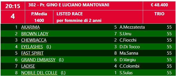- Nobile del Colle, la pupilla di Melania Cascione è alla terza in carriera, le corse precedenti sono sulla distanza dei 1.400 metri, a Roma ha perso da Ladise ma a Milano si è prontamente riscattata. Attenzione