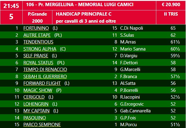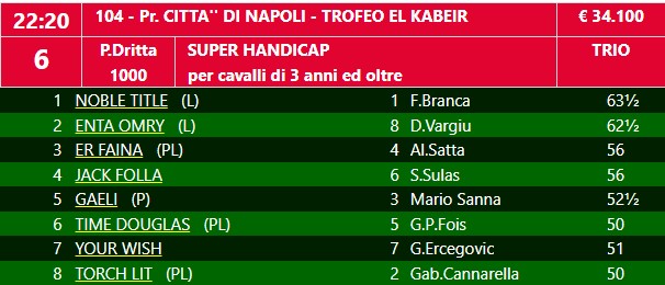 Commento tecnico: Noble Title vuole riscattarsi, Enta Omry sta letteralmente volando. Er Faina, il nome è una garanzia. Jack Folla ha vinto a Milano, Pisa, Roma e punta a vincere anche a Napoli. Gaeli ha perso malamente l’ultima, può rifarsi. Time Douglas è fermo da 126 giorni, incognita contro gli avversari molto più rodati. Your wish ha sfoderato una prestazione maiuscola nell’ultima giornata del programma di Milano, correrà per vincere. Torch lit, l’ultima corsa è stata al Mediterraneo di Siracusa arrivando secondo, con 50 chili ed un Gab. Cannarella a bordo potrebbe sfoderare la prestazione storica, attenzione.