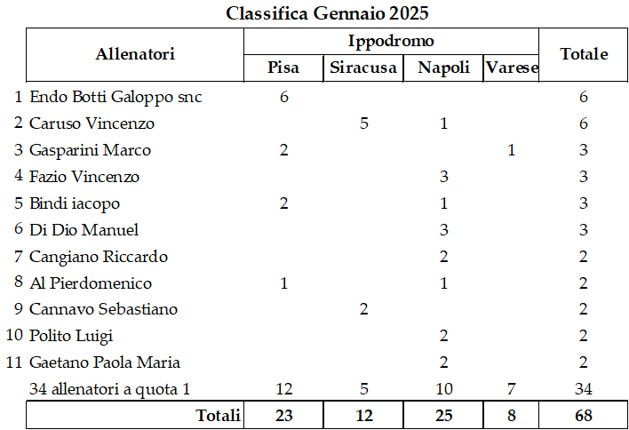 Le vittorie di “Endo Botti Galoppo snc” sono avvenute tutte a Pisa e sono: Condizionata (2): Premio Milani (Momento Giusto), Premio Verricelli (Cime Tempestose)