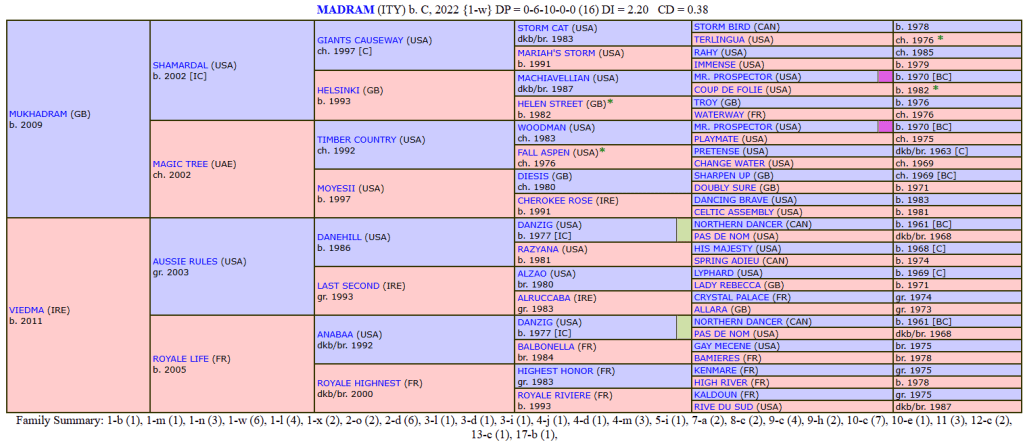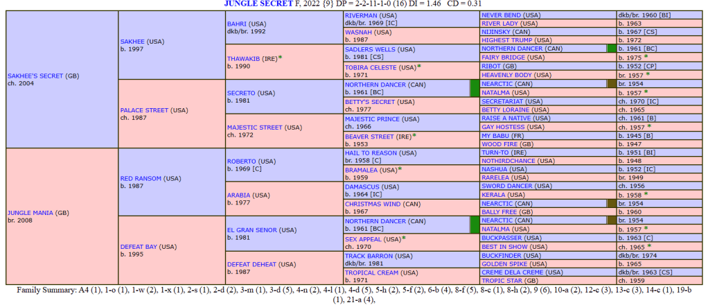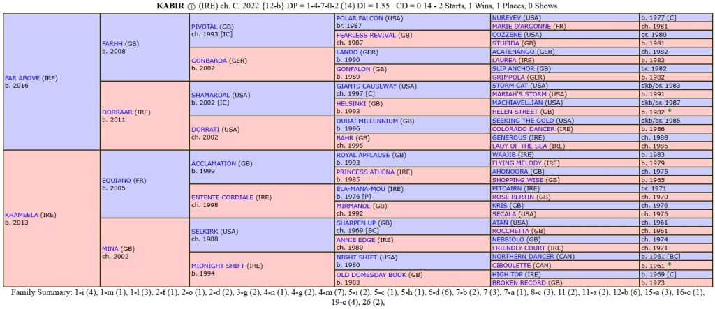 Il padre è Far Above (Farhh*/Dorrarr), vincitore a 3 e 4 anni, “Palace House Stakes” (GR3, 1.000 metri); la madre Khamela (Equiano/Mina) di cui non ci sono notizie. Kabir è outcrossing nelle prime 5 generazioni. In Totale ha 62 antenati diversi su un totale di 62 che compongono le 5 generazioni analizzate.