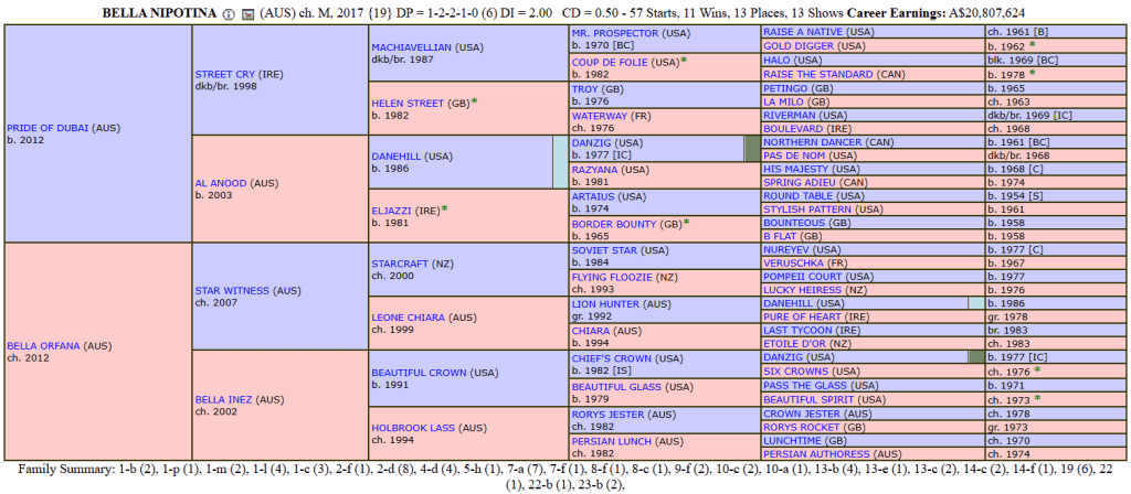 Bella Nipotina – AUS, Femmina ch. (28 settembre 2017 ->) famiglia 19 [DP: 6 DI: 2.00 CD: 0.50] 60 antenati diversi nelle ultime 5 generazioni (Danzig a cavallo 4° e 5° generazione, Danehill a cavallo tra la 3° e 5° generazioe)