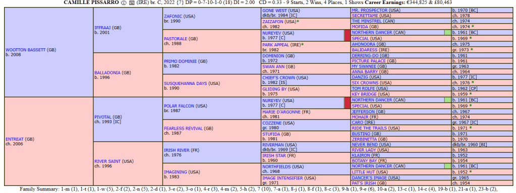A 2 anni: vince “Prix Jean-Luc Lagardere” (Fr-G1,2yoC&F,1400m,Lon) ed è secondo “Marble Hill Stakes”(Ire-G3,2yo,6fT,Cur) e “Anglesey Stakes” (Ire-G3,2yo,6.5fT,Cur). A 3: è secondo “Gladness Stakes” (Ire-L,7fT,Cur) e terzo nel “Poule d’Essai des Poulains” (Fr-G1,3yoC,1600m,Lon)