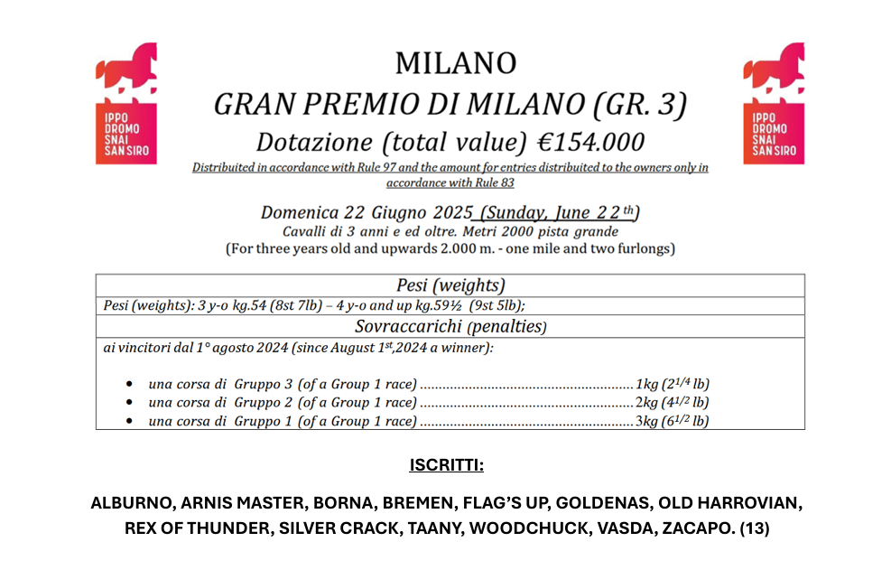 NOTA: ARNIS MASTER e WOODCHUCK sono iscritti sia nel Gran Premio Milano che nel Premio Carlo Vittadini