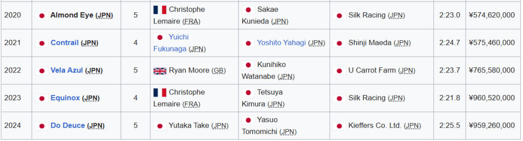 Japan Cup – GR1 per cavalli di 3 anni +, sulla distanza dei 2.400 metri. Luogo: Tokyo, Giappone. Periodo: terza decade di Novembre. Dotazione of JP¥1,090,000 di cui JP¥500,000,000 al vincitore. 2022 Vincitore: Vela Azul con il tempo di 2m23’70”. 2023 Vincitore: Equinox con il tempo di 2m21’80”. 2024 Vincitore: Do Deuce;
