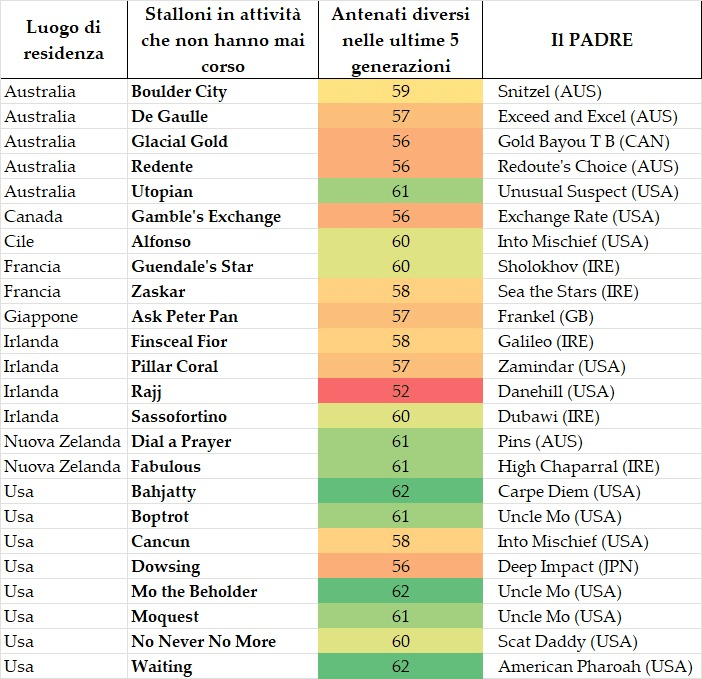 Nella tabella sottostante sono rappresentati gli stalloni in attività che non sono mai scesi in Pista ovvero NON HANNO MAI CORSO. In tutto sono 24 e rappresentano il 1,32% del censimento.
