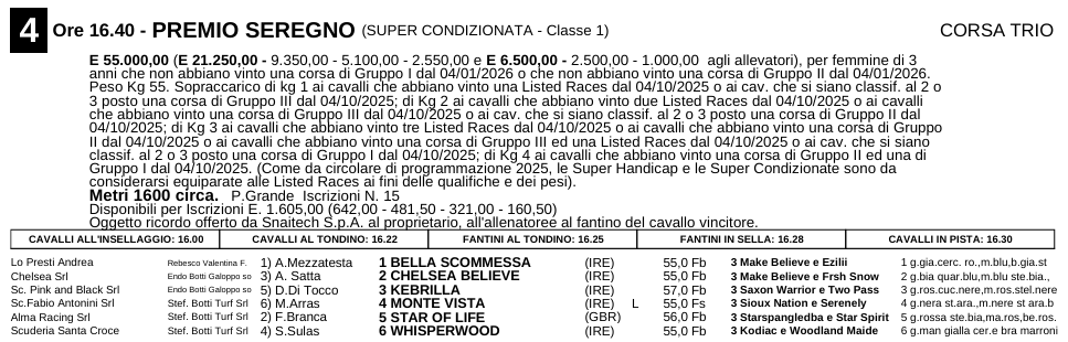 Una corsa con sole sei partenti, anche in questo caso oserei dire le migliori femmine della classe 2023 in circolazione in Italia, Stefano Botti ne schiera tre: Monte Vista, Star of life e Whisperwood. Endo botti due: Chelsea Believe e Kebrilla, poi c’è un’inedita Valentina Rebesco che con “Bella Scommessa” è di nome e di fatto nella lotta tra i cugini più titolati d’Italia.