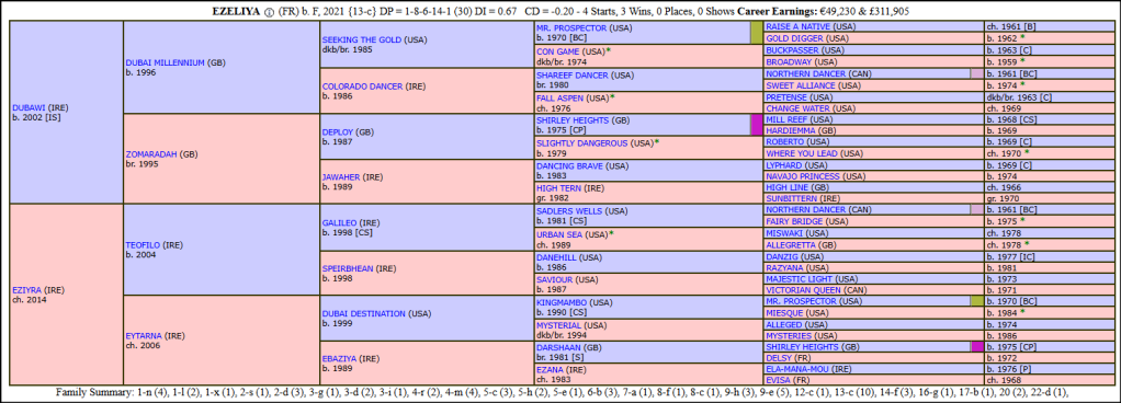 | 31/05 | Inghilterra | Epsom | Oaks | €640.000 | 3 | 2.414 | Ezeliya | 2021 | fem | Dubawi | 13-c | Dance Sequence | War Chimes | You got to me | |