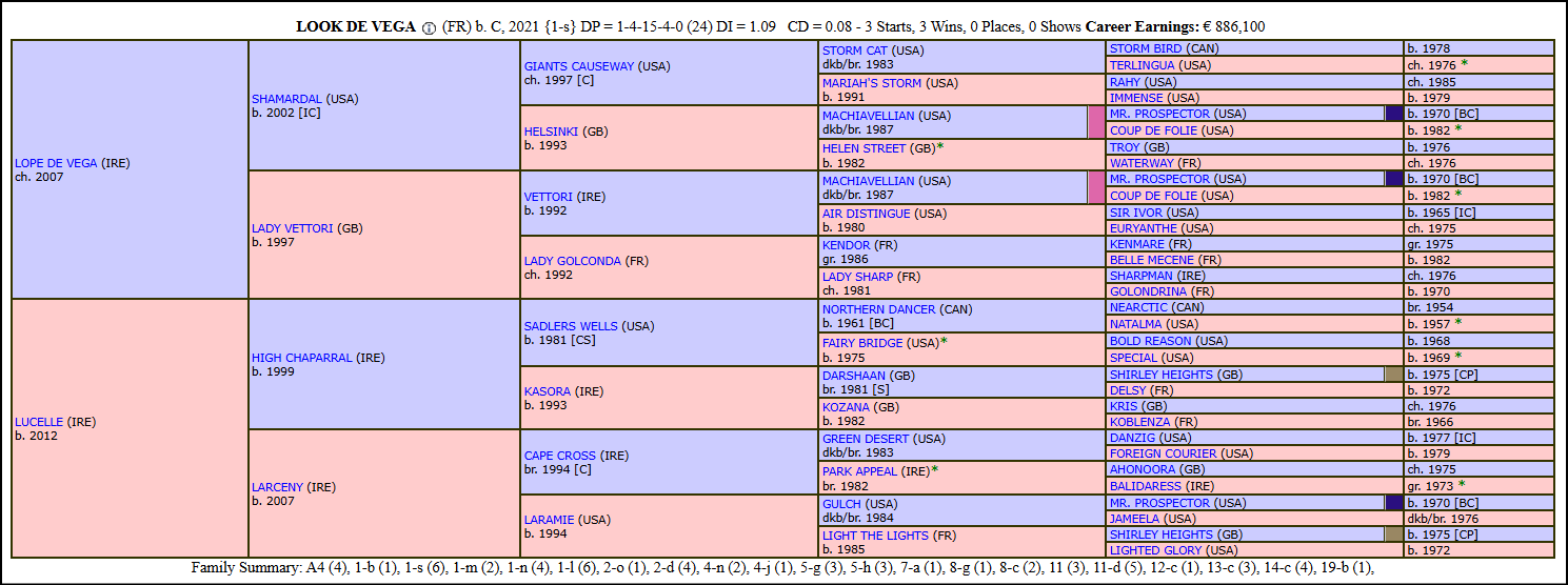 | 02/06 | Francia | Chantilly | Prix du Jockey Club | €1.500.000 | 3 | 2.100 | Look de Vega | 2021 | mas | Lope de Vega | 1-s | First Look | Sosie | Ghostwriter | |